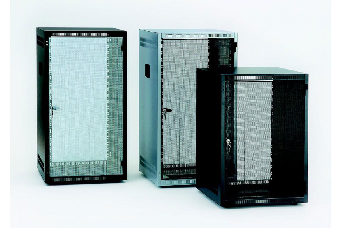 19" steel rack. rack rails on the front and back sides. Plastic handles on the side panels. steel performated front door with lock. Accesories: rubber feet or castors.